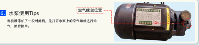 第一次使用前,斷開水電,打開排污閥及蒸汽出口球閥,打開水泵泵頭的排空氣螺絲(具體位置如下圖),將機(jī)器內(nèi)部殘余水分排干:由于前期機(jī)器出廠前調(diào)試,剩余部分蒸汽殘留在機(jī)器管道內(nèi),此時假性氣體冷凝成水,就會導(dǎo)致第一使用時,水無法抽進(jìn)內(nèi)膽。故而需要此步驟。
