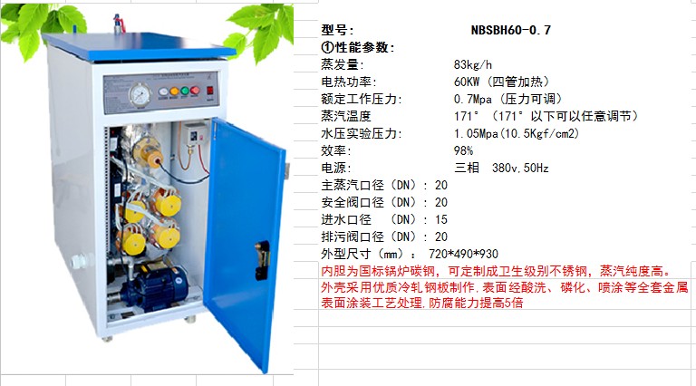 諾貝思60KW電加熱蒸汽發(fā)生器NBSBH60KW: