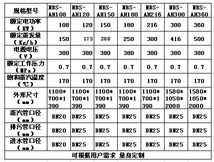 規(guī)格型號 NBS-AH360 額定電功率(KW) 360 額定蒸發(fā)量(Kg/h) 500 電源電壓(V) 380 額定工作壓力(MPa) 0.7 飽和蒸汽溫度(℃) 170 外形尺寸(mm) 1580*1050*2000 蒸汽管口徑(mm) DN25 排污管口徑(mm) DN25 進水管口徑(mm) DN25