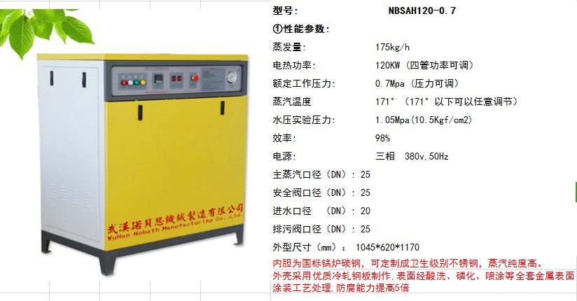 諾貝思175kg/h全自動(dòng)電加熱蒸汽發(fā)生器NBSAH120KW: