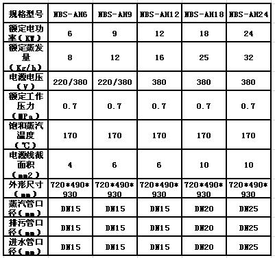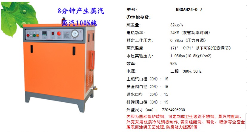 規(guī)格型號 NBS-AH24 額定電功率(KW)24 額定蒸發(fā)量(Kg/h)32 電源電壓(V) 380 額定工作壓力(MPa) 0.7 飽和蒸汽溫度(℃) 170 電源線截面積(mm2) 4 外形尺寸(mm) 720*490*930 蒸汽管口徑(mm) DN15 排污管口徑(mm) DN15 進水管口徑(mm) DN15 加熱器 雙管