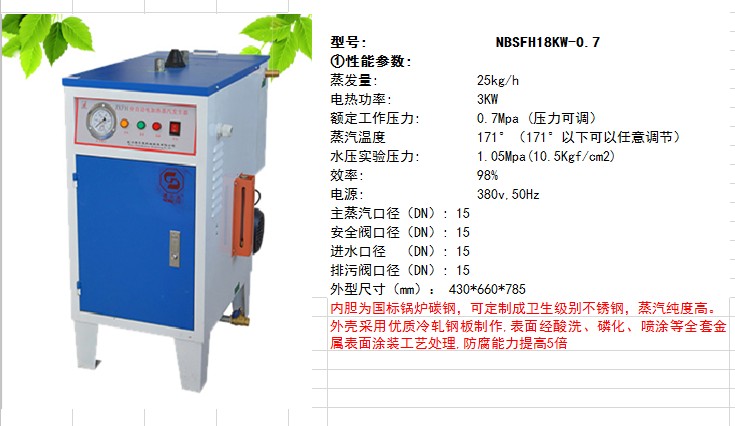 諾貝思18KW電加熱蒸汽發(fā)生器NBSFH18KW參數(shù):