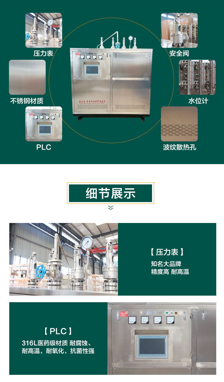 醫(yī)療制藥定制不銹鋼P(yáng)LC蒸汽發(fā)生器是諾貝思蒸汽發(fā)生器特別定制款之一,是諾貝思研發(fā)的產(chǎn)品之一,該產(chǎn)品采用加厚316L不銹鋼,新穎美觀,四輪帶剎車,移動方便,采用高質(zhì)量零部件,內(nèi)膽水箱都是316L不銹鋼,蒸汽潔凈抗菌強(qiáng)多用于食品醫(yī)療,3-6分鐘可達(dá)到蒸汽飽和且蒸汽純度高,三重連鎖安全保障,PLC智能顯示。
